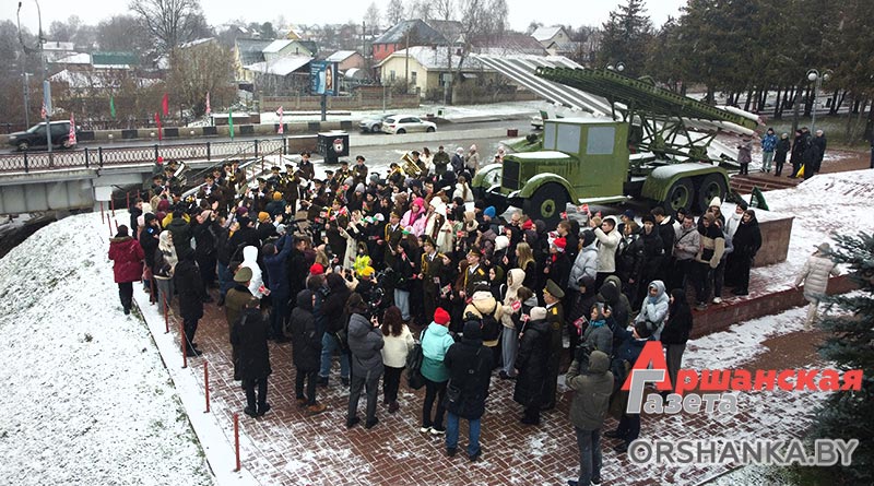 Флешмоб нашел живой отклик в сердцах жителей города. Ведь, как известно, первые залпы «катюши» прогремели именно под Оршей. Вместе с военным оркестром прямо у мемориала боевой машины оршанцы, гости и участники «Марафона единства» в сопровождении оркестра Военной академии Республики Беларусь исполнили любимую песню многих поколений, которая стала символом Победы.
