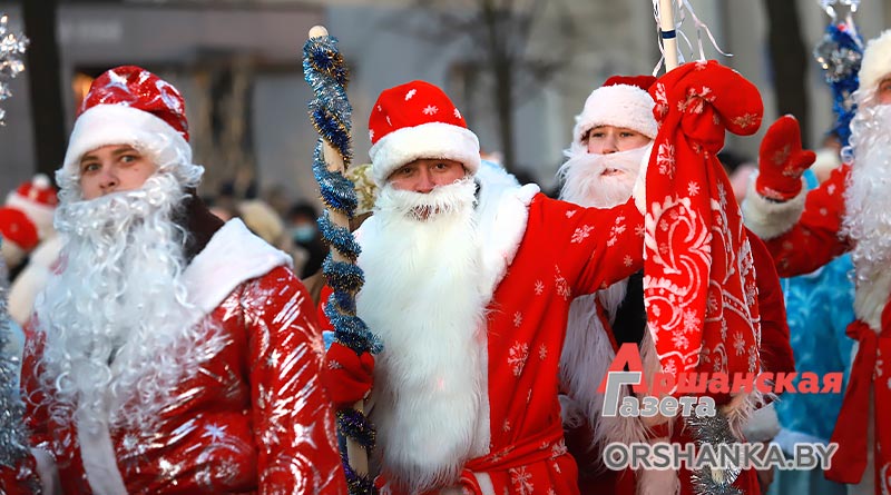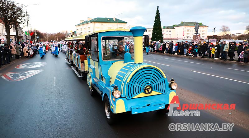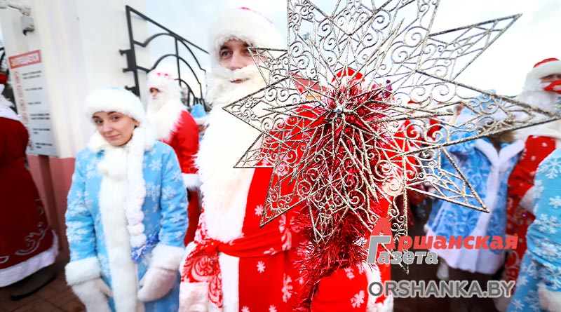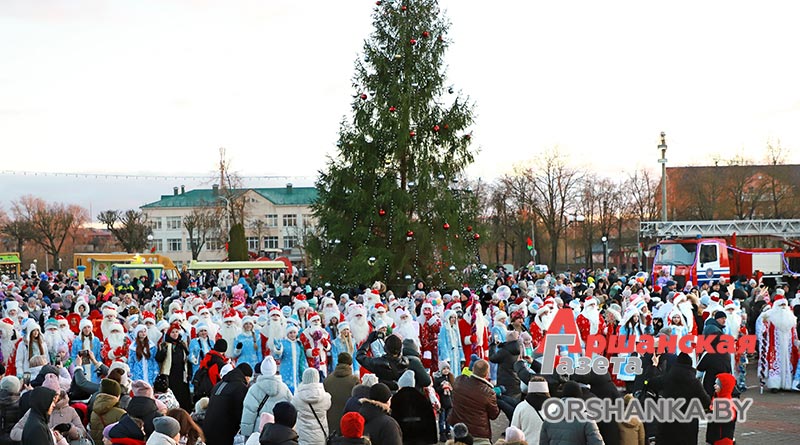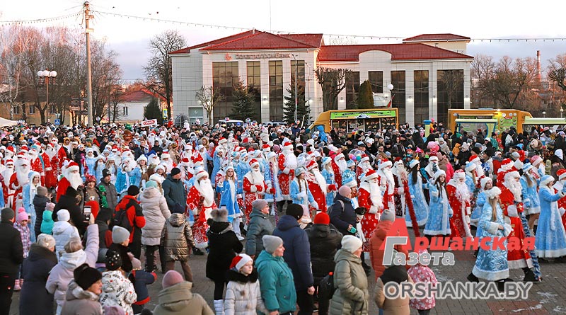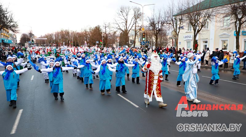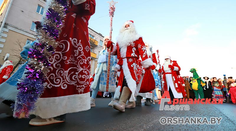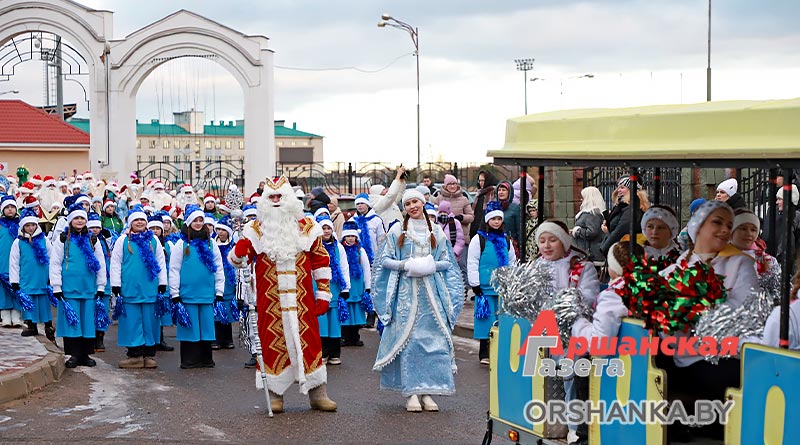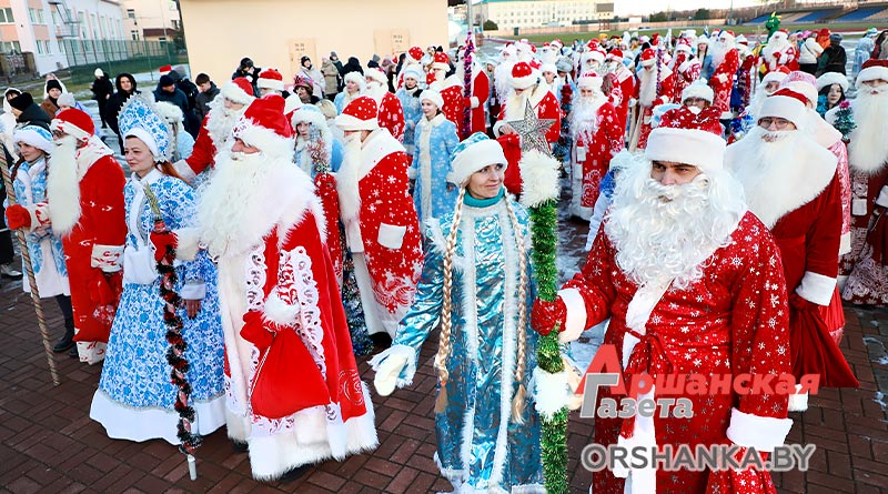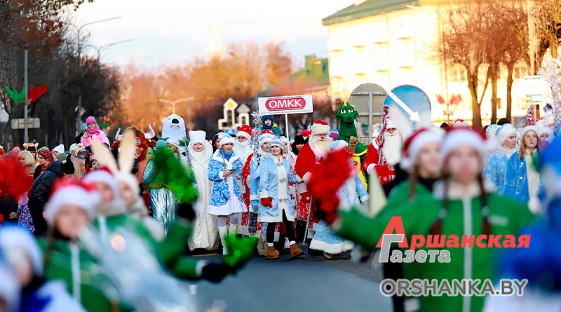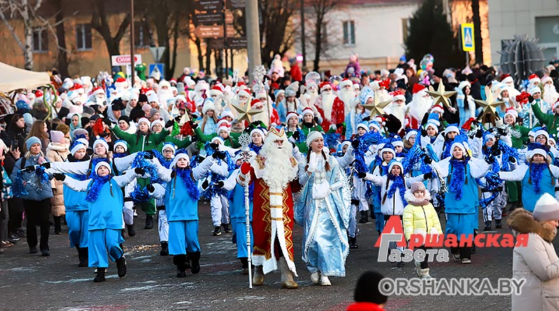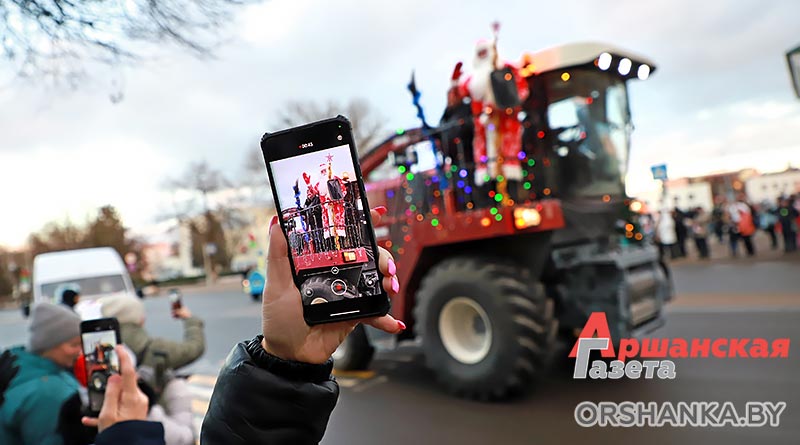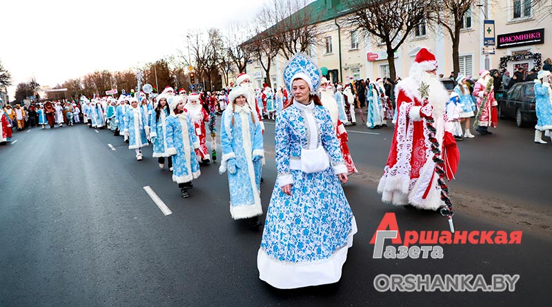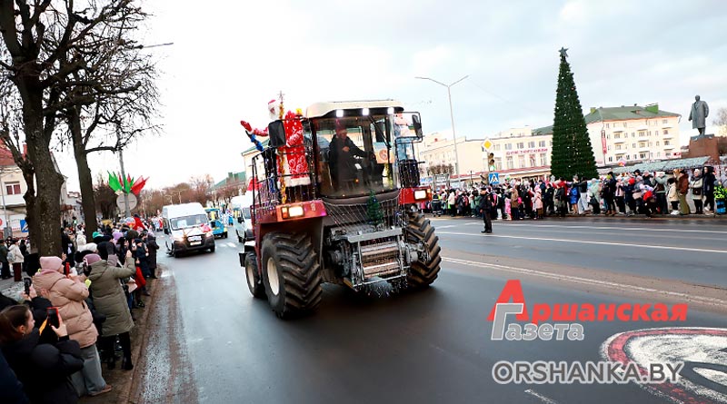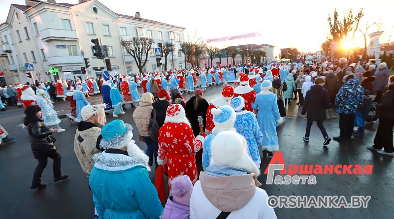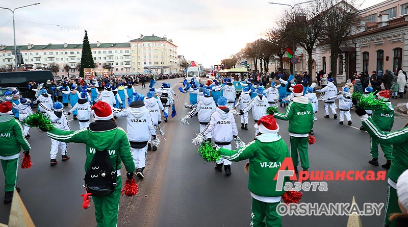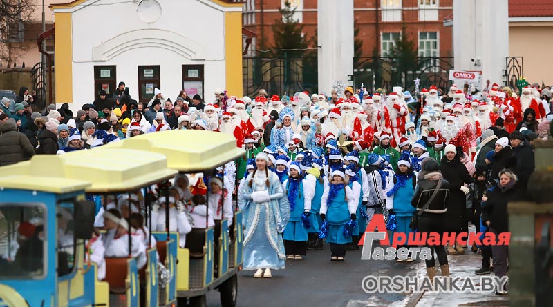 Такого количества Дедов Морозов и Снегурочек наш город еще не видел! Только 55 пар главных новогодних героев и около сотни сказочных персонажей. Впереди колонны участников ехал праздничный кортеж, который возглавлял комбайн КВК-800 «Палессе FS80» Оршанского райагросервиса. За ним следовали украшенные новогодней атрибутикой микроавтобусы, сказочный паровозик и жители города.