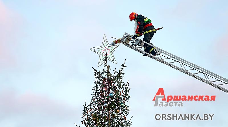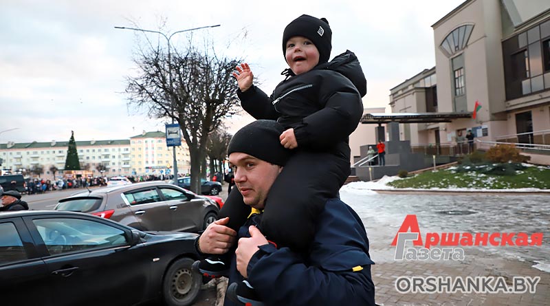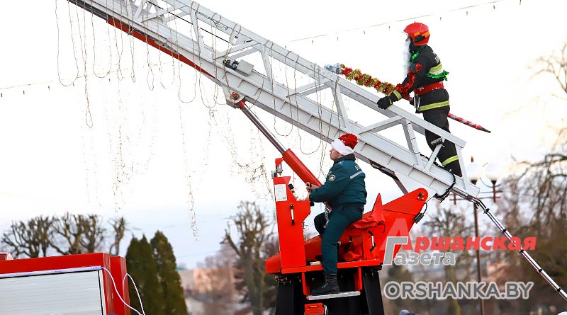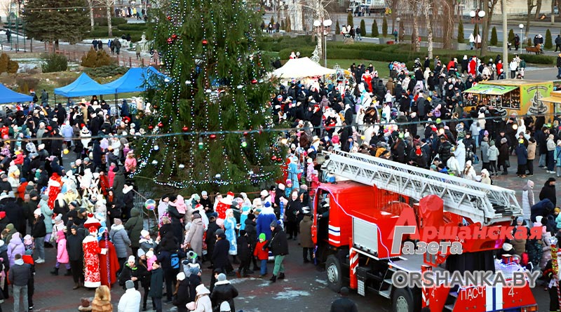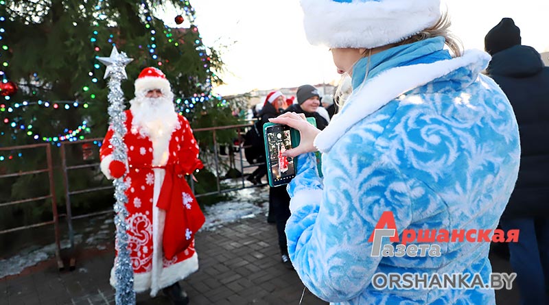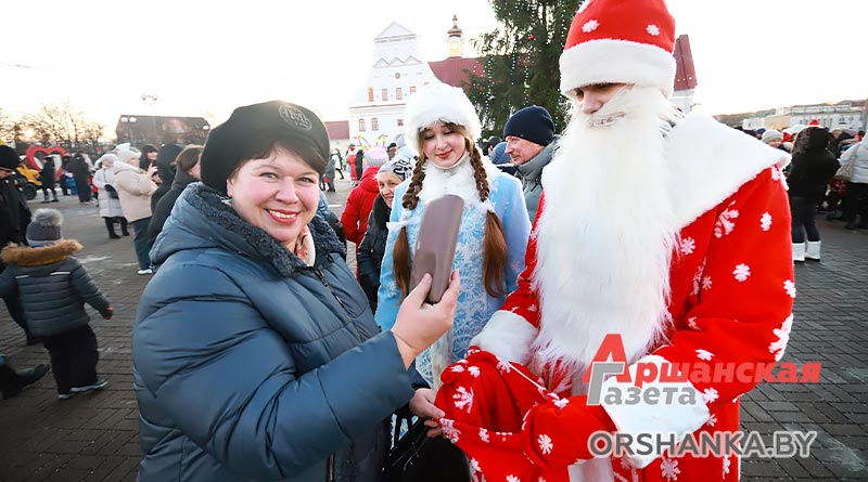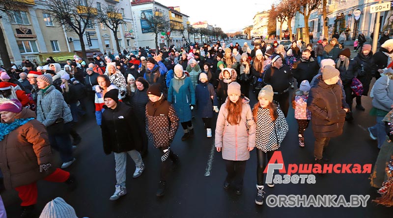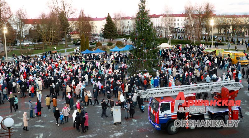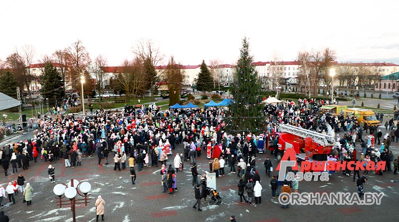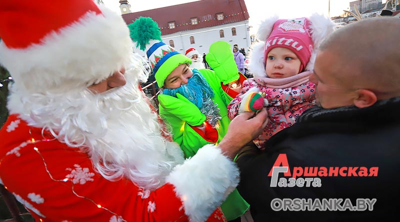 Участники прошли по улице Владимира Ленина до площади коллегиума иезуитов и собрались вокруг главной новогодней красавицы. Здесь состоялось зажигание огней на городской ёлке. Правда, Дедушке Морозу и Снегурочке понадобилась помощь спасателей, чтобы ёлка засверкала огнями.