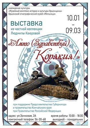 10 января в 15.00 в Оршанском этнографическом музее «Мельница» откроется выставка из частной коллекции Людмилы Каюровой «Амто (здравствуй), Корякия!». Она проводится при поддержке Представительства Губернатора и Правительства Камчатского края при Правительстве Российской Федерации.