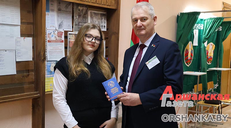 После того как Кира сделала свой выбор, ей, как впервые голосующей, подарили книгу «Символы суверенной Беларуси», а также брендированную футболку от БРСМ с логотипом «Мой голос первый».