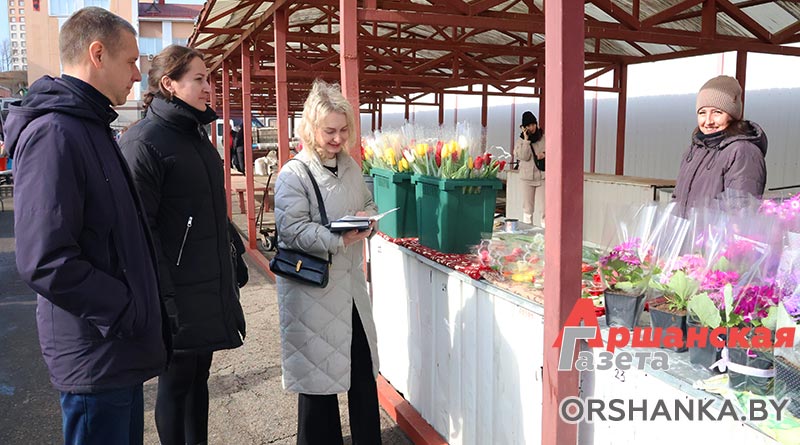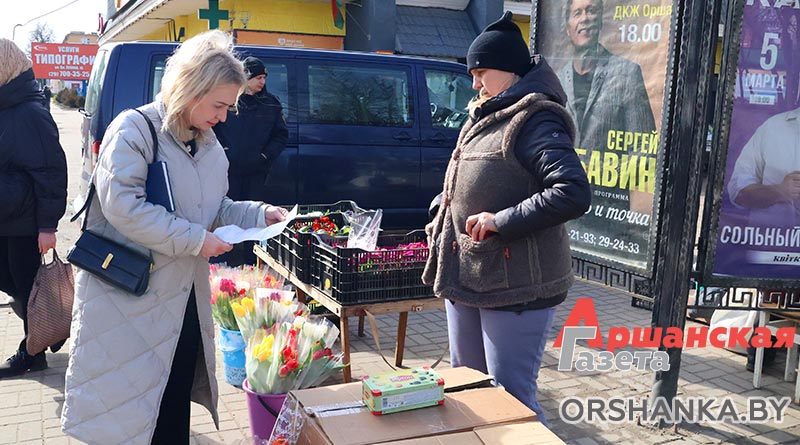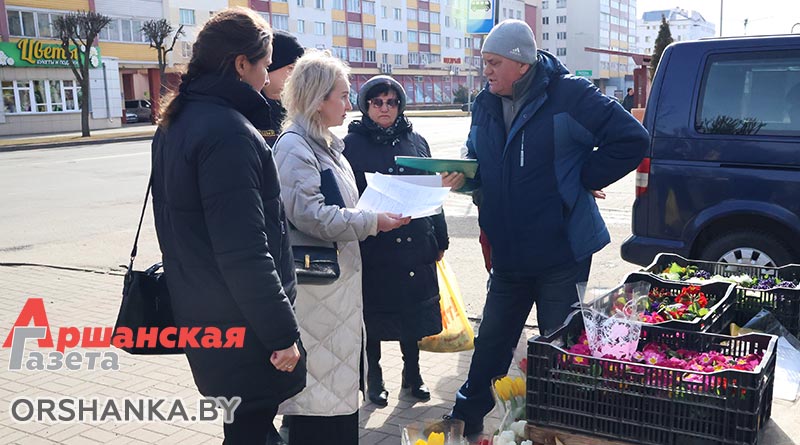 В преддверии Дня женщин представители отдела торговли Оршанского райисполкома и Оршанского РУВД провели контрольно-аналитические мероприятия по вопросу соблюдения законодательства при реализации цветочной продукции субъектами хозяйствования и физическими лицами. С ними в рейд отправилась и журналист «Аршанскай газеты».