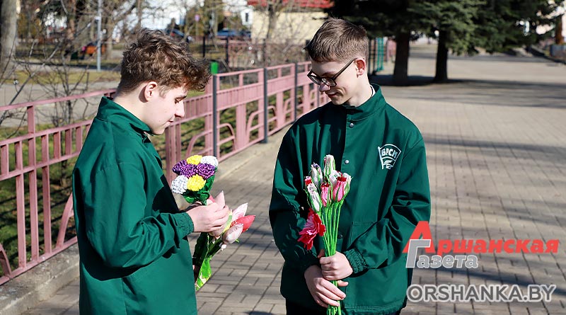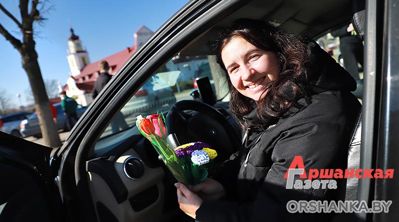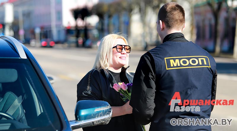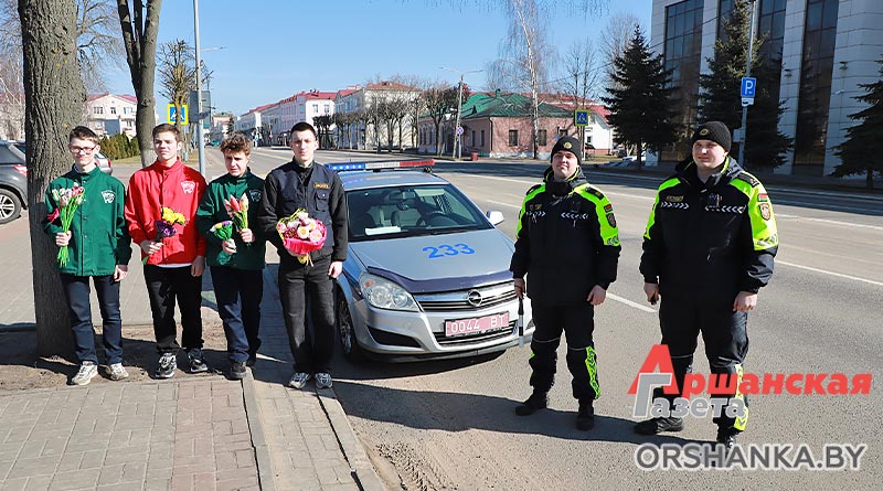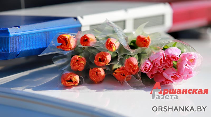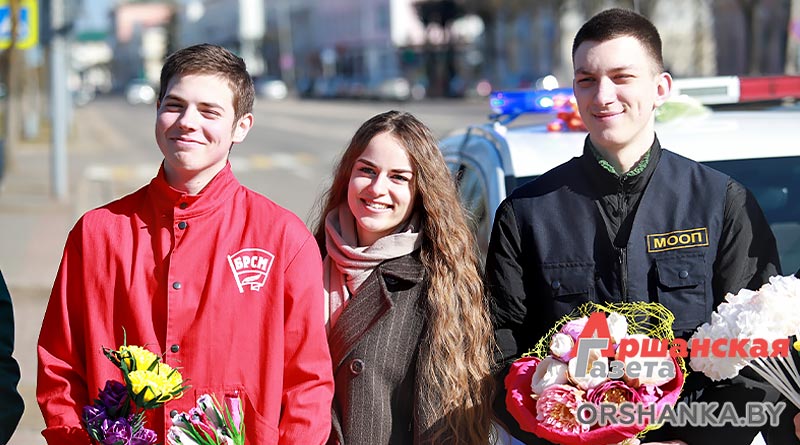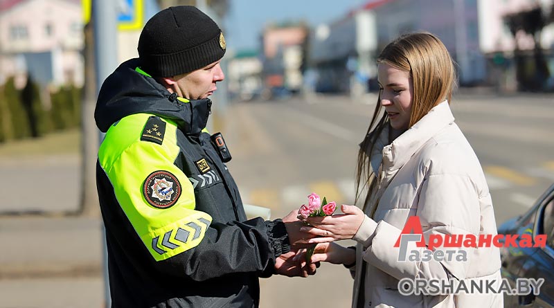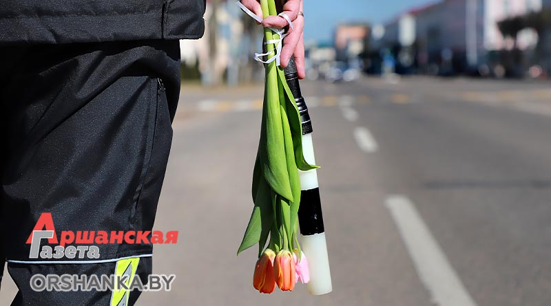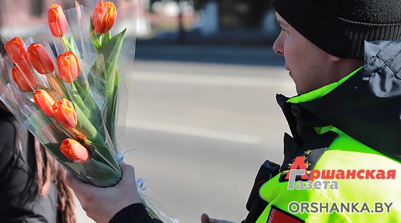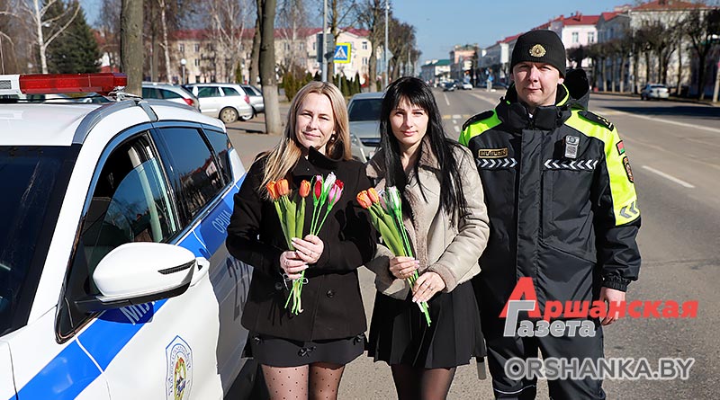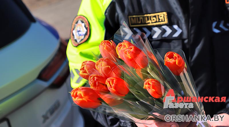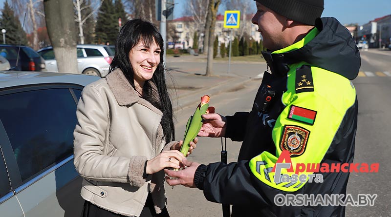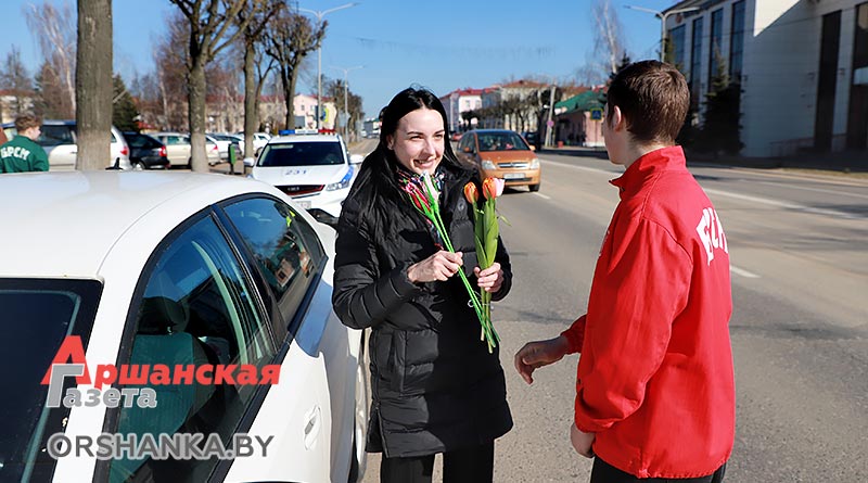 В полдень экипаж ГАИ Оршанского РУВД совместно с бойцами молодежного отряда охраны правопорядка БРСМ разместились на спокойном участке ул. Владимира Ленина. Всех проезжающих мимо женщин поздравляли с наступающим праздником 8 Марта. Вручали тюльпаны и цветы, изготовленные молодежным активом. Дарили хорошее настроение и одновременно призывали быть внимательными на дороге.