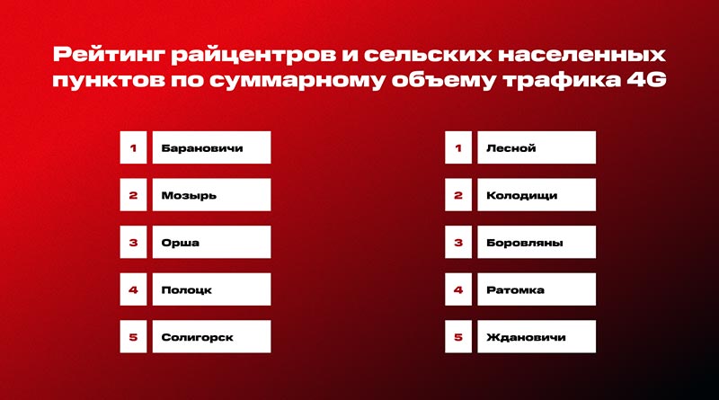 По данным МТС, среди районных центров наибольший суммарный объем 4G-трафика генерируют жители в Барановичей. Здесь пользователи ежемесячно потребляют почти 1,4 тысячи Тб данных. Следом идут Мозырь, Орша, Полоцк и Солигорск.