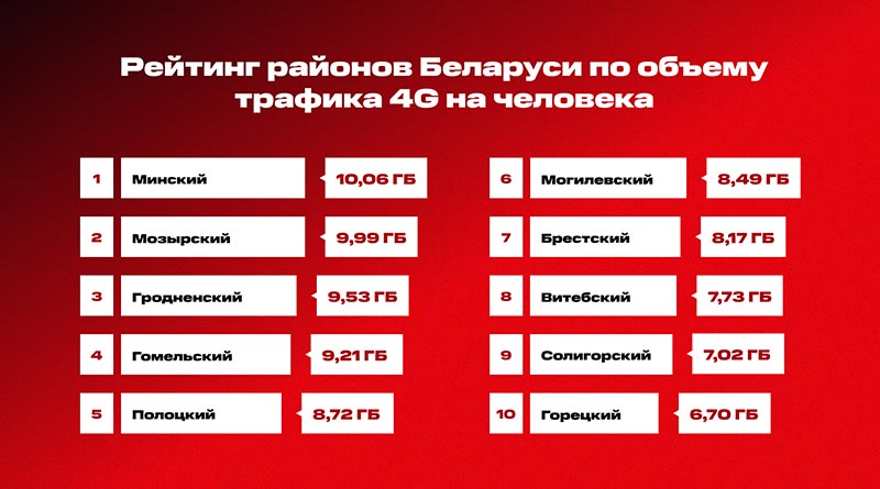 Как подсчитали в МТС, самым активным районом страны по использованию мобильного трафика 4G стал Минский район с 10,06 Гб использованного трафика на одного абонента. На втором месте оказался Мозырский район с практически идентичным показателем — 9,99 Гб в месяц.