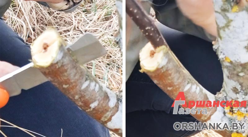 Делаем расщеп на подвое и вставляем черенок в расщеп, совмещая камбиальные слои