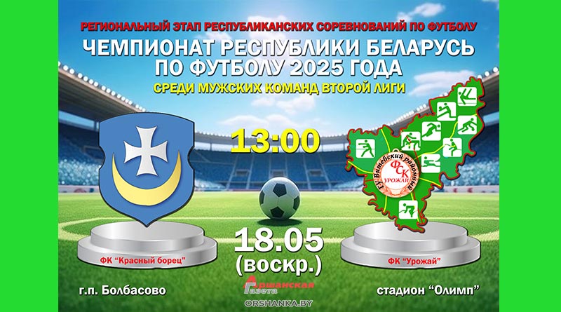 18 мая в г.п. Болбасово на стадионе «Олимп» пройдет матч регионального этапа республиканских соревнований чемпионата Республики Беларусь по футболу среди мужских команд второй лиги между командами «Красный борец» (Орша) и «Урожай» (Витебский район).