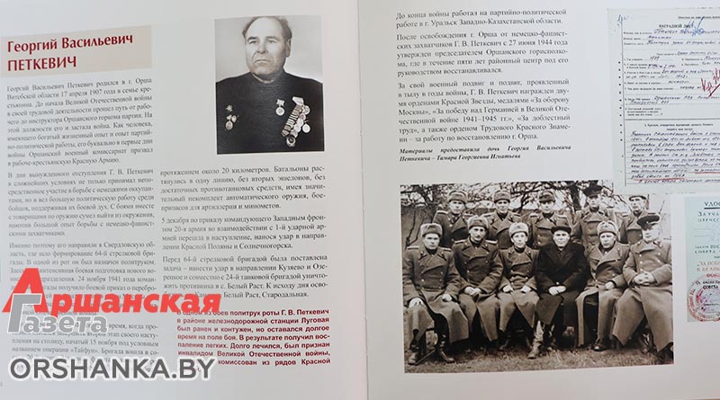 Стоит отметить, что благодаря личному участию депутата Палаты представителей Национального собрания Республики Беларусь Александра Михно, в издание вошли материалы о нашем земляке – участнике Великой Отечественной войны Петкевиче Георгии Васильевиче. Его жизнь – пример стойкости и мужества. Георгий Васильевич с 27 июня 1944 года был председателем Оршанского горисполкома. Под его руководством Орша восстанавливалась после войны. Это были невероятно сложные годы.
