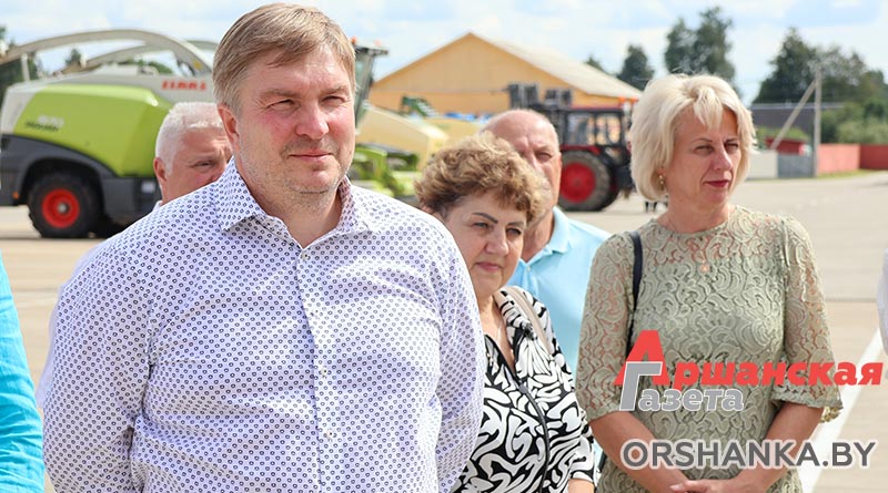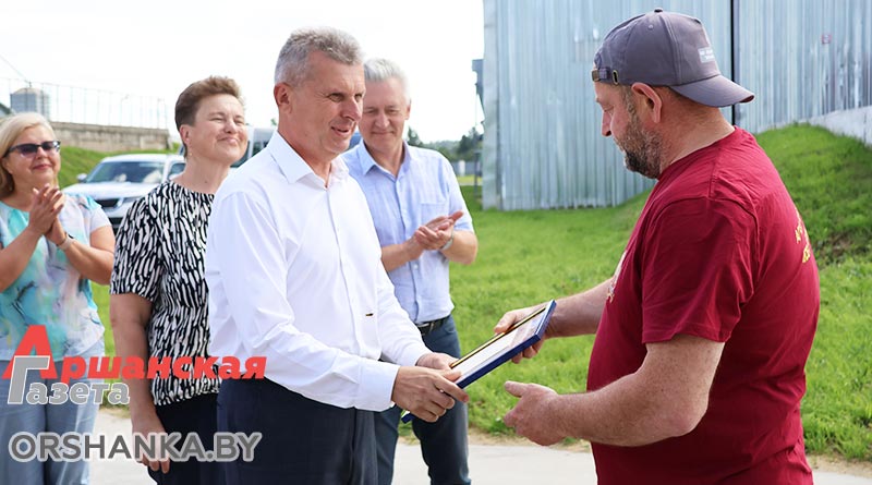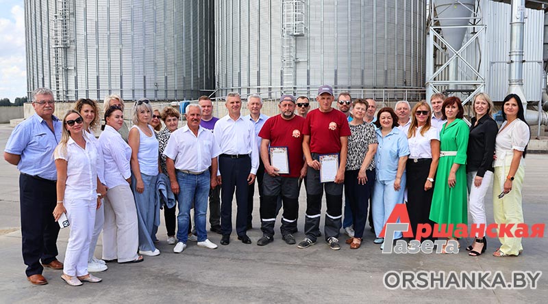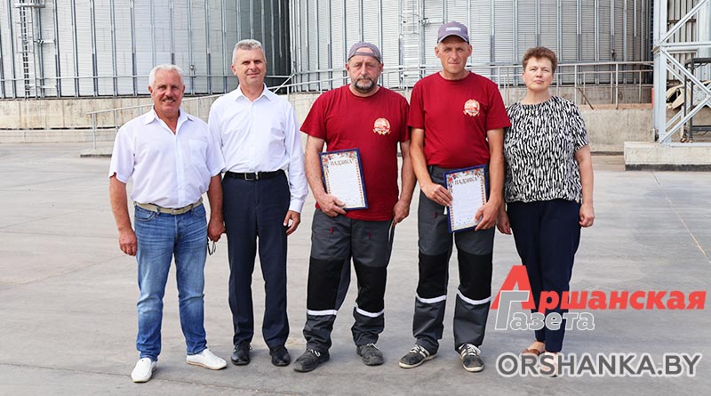 На зерносушильном комплексе в аг. Зубово Николай Шум и Светлана Парчевская вручили благодарности участникам уборочной кампании начальнику участка доработки, хранения и переработки продукции растениеводства Александру Медведеву и оператору сушильного оборудования Андрею Коренькову.