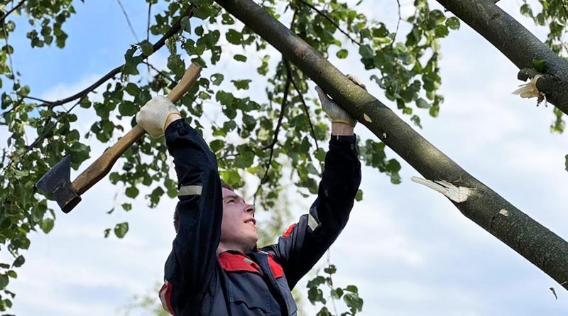 Перед началом работ со всеми участниками был проведен инструктаж по технике безопасности. Затем вооружившись топорами и пилами волонтеры приступили к работе. Наши парни помогали в уборке завалов от поваленных бурей деревьев. Работа велась активно: волонтеры распиливали древесину, выносили ее, а затем на тракторах и машинах коммунальные службы вывозили мусор.