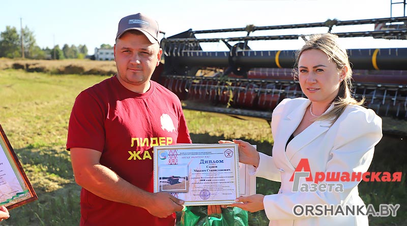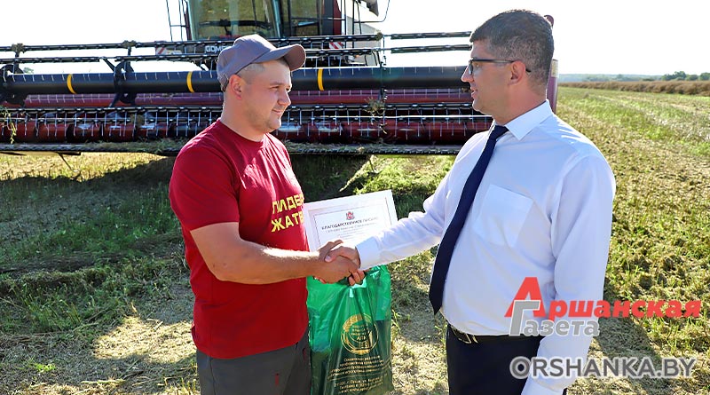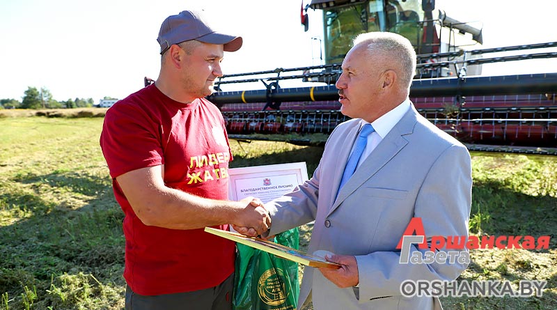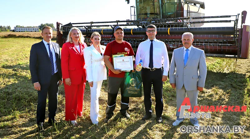Прямо в поле в д. Антоновка героя жатвы поздравили первый заместитель председателя Витебского облисполкома Сергей Левкович, председатель Оршанского райисполкома Игорь Мороз, директор ОАО «Агрокомбинат «Юбилейный» Александр Фирсин, руководство профкома области, района и хозяйства.
