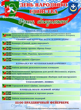 Программа мероприятий по празднованию Дня народного единства 17 сентября в Орше.