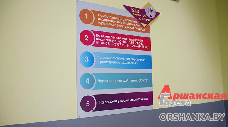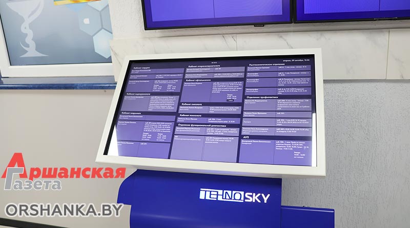 В учреждении здравоохранения в полном объеме проведена компьютеризация. Обустроено 97 автоматизированных рабочих мест, установлено девять информационных табло, шесть терминалов «Электронная очередь», четыре терминала «Электронная регистратура», работает колл-центр. По талонной системе на оказание плановой медицинской помощи можно записаться за три месяца.