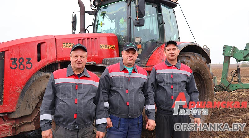 На одном из полей встречаю экипажи аграриев. Здесь работают Василий Вальц, Николай Сластенко и уже хорошо известный читателям «Аршанкі» Денис Пшенный. Они пашут землю под озимый сев. Настроение, несмотря на дождливую погоду, у всех боевое.