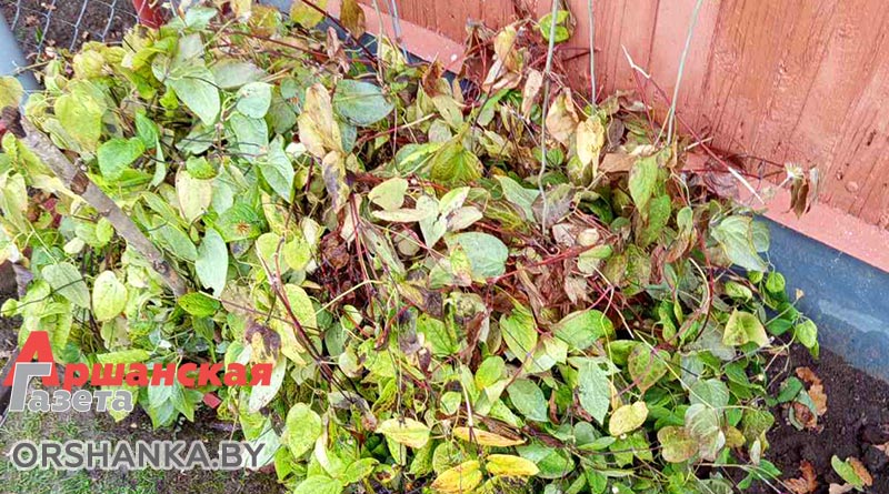Клематисы снимаем с опоры, обрезам в зависимости от вида, укладываем на землю и накрываем лапником или агроволокном.