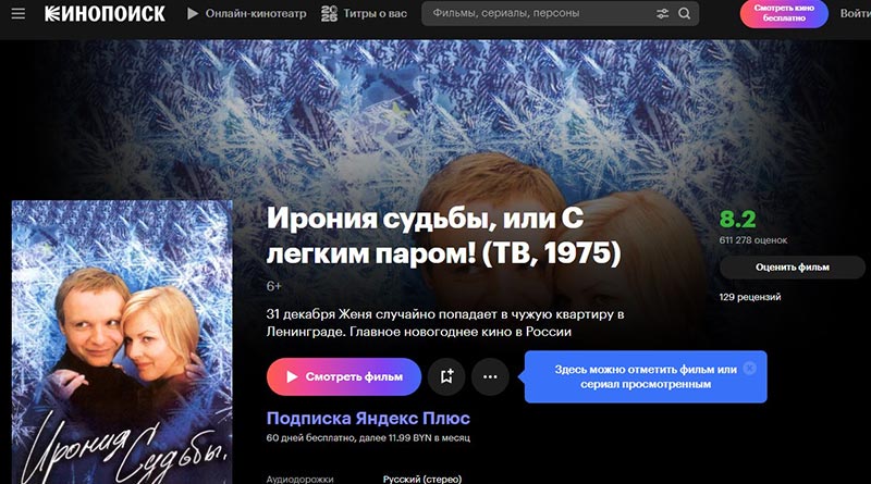 В новогоднюю ночь на Кинопоиске, который исследование ICMR назвало онлайн-кинотеатром № 1 в Беларуси ожидаемо лидировала классика. Абсолютным фаворитом стала «Ирония судьбы, или С легким паром!», которая собрала максимальную аудиторию именно 31 декабря. В топе также оказалась новинка «Невероятные приключения Шурика», новая «Алиса в Стране чудес» с Анной Пересильд, мультфильм «Горыныч» и, что неожиданно, сериал «Монастырь». В целом, зрители выбирали семейный и хорошо знакомый контент.