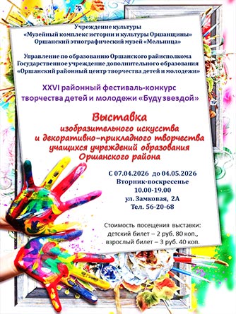 С 7 апреля по 5 мая в Оршанском этнографическом музее «Мельница» работает выставка XXVI районного фестиваля-конкурса творчества детей и молодежи «Буду звездой».