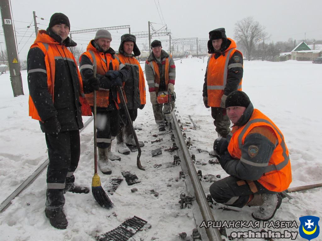 Для очистки от снега железнодорожных путей работники Оршанской дистанции пути Минского отделения Белорусской железной дороги задействовали снегоуборочную машину.