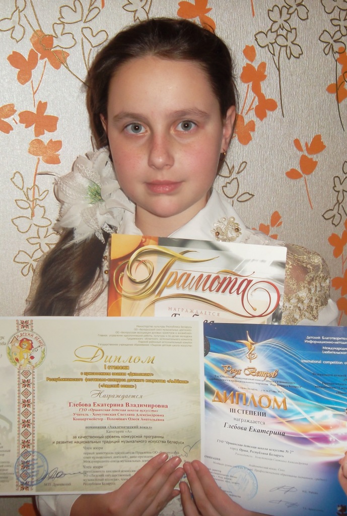 — дипломант II степени открытого республиканского фестиваля-конкурса юных пианистов в номинации «Соло» (г. Клецк, Беларусь, 2012 г);