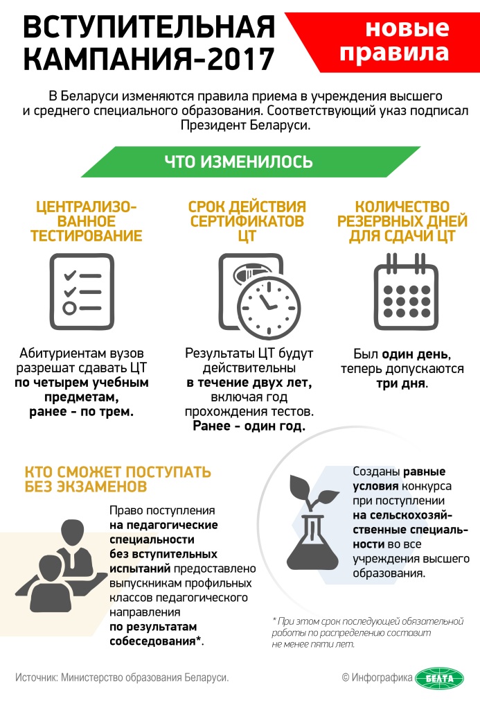 Изменения и дополнения в правила приема сохраняют сложившуюся систему приема в учреждения высшего и среднего специального образования, обеспечивают соблюдение разумного баланса интересов государственных органов — заказчиков кадров, учреждений образования, абитуриентов и их родителей, а также направлены на повышение конкурентоспособности учреждений профессионального образования республики и качества отбора наиболее подготовленных абитуриентов.