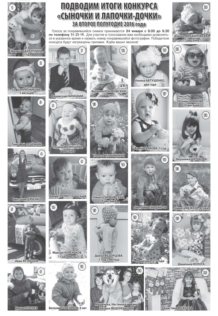 24 января с 9.00 до 9.30 по телефону 51-25-19 состоится голосование, которое определит победителей конкурса детских фотографий «Сыночки и лапочки-дочки» за 2 полугодие 2016 года. Чтобы отдать голос за участника, нужно дозвониться в редакцию и назвать номер, под которым опубликовано фото в «АГ» №7 за четверг, 19 января 2017 года.