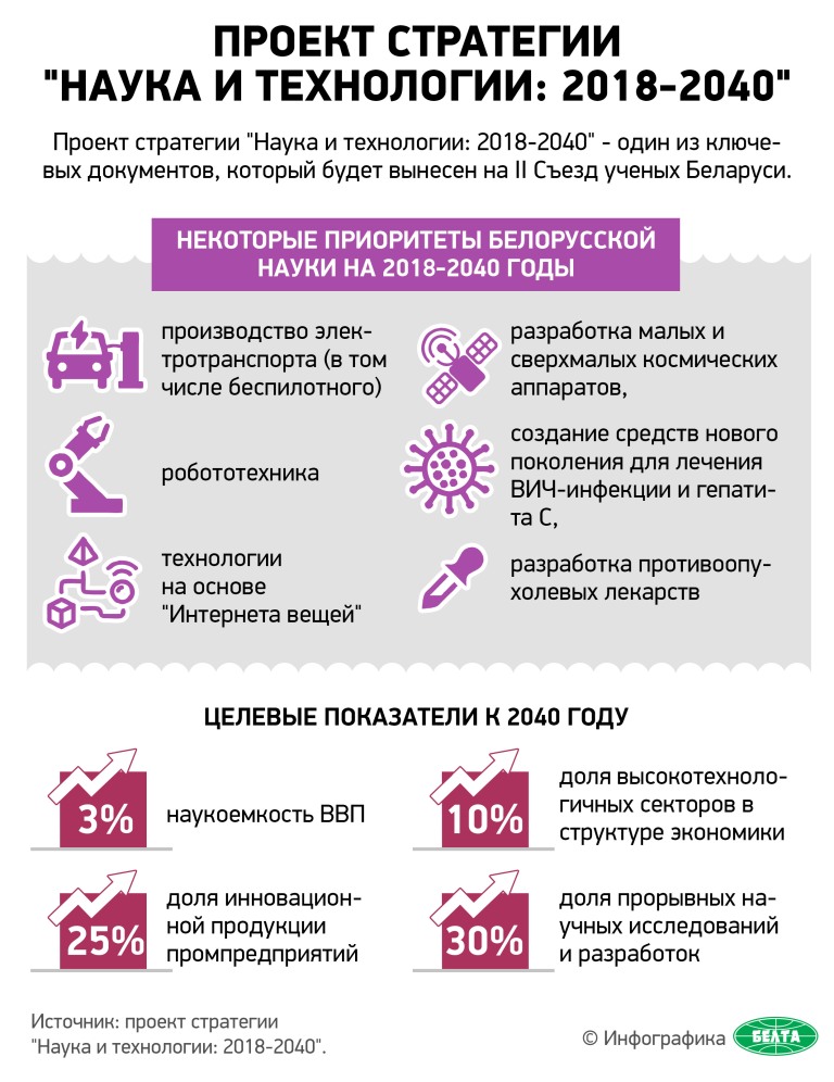 Ключевым документом, который вынесен на II Съезд ученых Беларуси, стал проект стратегии «Наука и технологии: 2018-2040». В настоящее время данный проект проходит общественное обсуждение. В стратегии определены приоритеты долгосрочного развития науки и технологий, а также комплекс инструментов совершенствования научно-технической сферы, которые обеспечат новое качество экономического роста Беларуси и выход в перспективе на мировой уровень по ряду направлений. Стратегия разработана учеными НАН Беларуси с учетом замечаний и предложений, поступивших от органов госуправления, рабочих групп и отдельных ученых. Предполагается, что благодаря реализации стратегии к 2040 году наукоемкость ВВП должна составить 3%, доля прорывных научных исследований и разработок — 30% в общем объеме, доля высокотехнологичных секторов в структуре экономики — 10%. В общем объеме производства промпредприятий 25% будет занимать инновационная продукция.