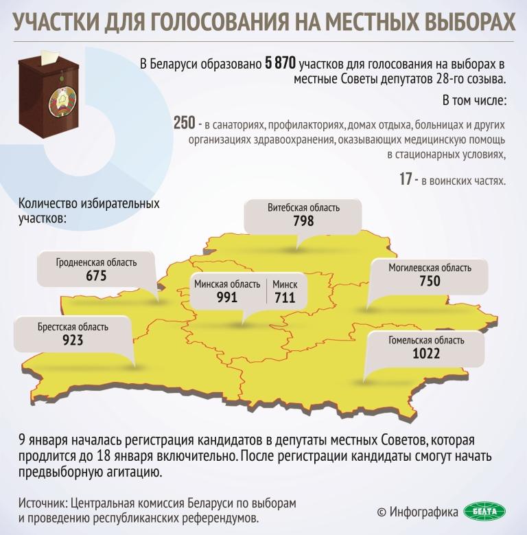 Выборы в местные Советы депутатов пройдут в Беларуси 18 февраля, проголосовать досрочно можно будет с 13 по 17 февраля. Регистрация кандидатов завершилась 18 января. Сразу после регистрации кандидаты могут приступать к агитации: выступать в СМИ, проводить митинги и пикеты, знакомить избирателей со своими программами.