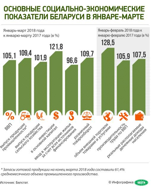 «В первом квартале текущего года выполняются все важнейшие параметры прогноза, утвержденные главой государства. В том числе по темпу роста ВВП — 105,1%, экспорту товаров и услуг — 129,8%. Сальдо внешней торговли — $206 млн. Инфляция в пределах прогноза: март к декабрю — плюс 2,5%», — сообщил Андрей Кобяков.