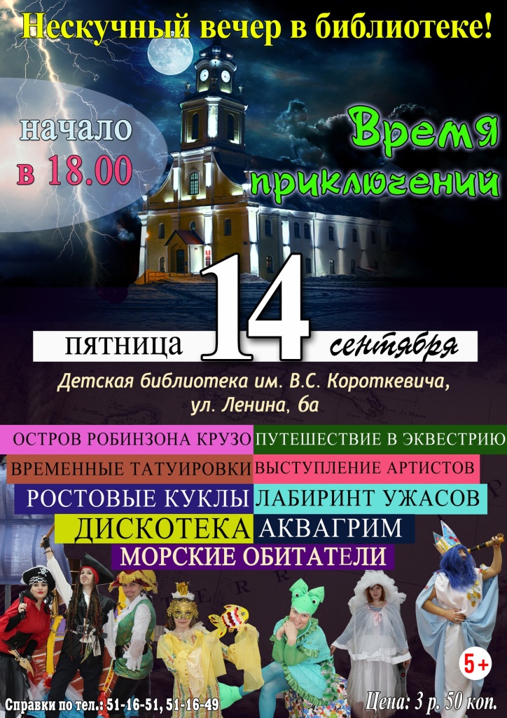 Культура Оршанцев приглашают на нескучный вечер в библиотеке 12.09.2018 10846 orshanka Комментариев нет В пятницу, 14 сентября в 18.00 в детской библиотеке им. В. Короткевича (коллегиум иезуитов) начнется нескучный вечер в библиотеке «Время приключений».