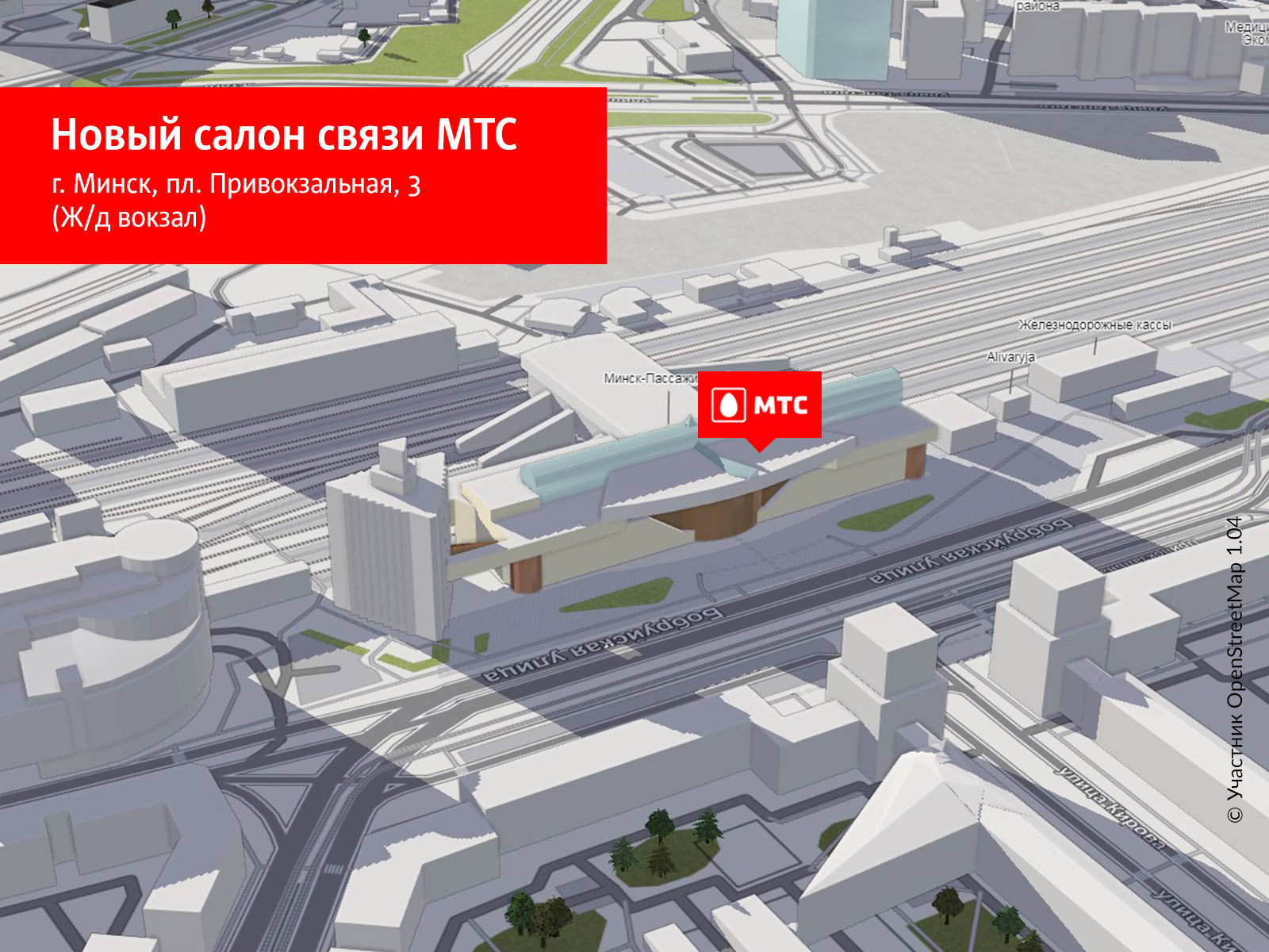 Новый офис заработал 3 декабря в Минске в здании Железнодорожного вокзала по адресу пл. Привокзальная, 5. В честь открытия на протяжении 7 дней будет действовать специальная акция: каждый клиент нового салона получит бонус — на выбор 100 минут на разговоры внутри сети, 100 МБ или 100 SMS.