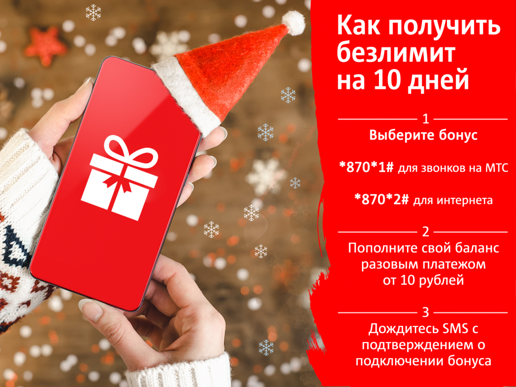 В последние дни года МТС предлагает запастись безлимитом минут и интернета для поздравлений с наступающими праздниками. Пополнив свой счет разовым платежом на сумму от 10 рублей по 29 декабря, абоненты оператора смогут получить бонус на выбор — безлимит интернета или звонков внутри сети на 10 дней.
