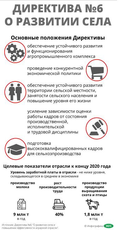 В качестве одного из направлений развития аграрной отрасли Директивой №6 закреплено достижение экономически целесообразных объемов производства. Они определены исходя из природного потенциала, производственных мощностей и технологических резервов. При выполнении установленных Директивой заданий к концу 2020 года объемы производства молока в стране должны достигнуть 9 млн т в год, продукции выращивания скота и птицы — 1,8 млн т.