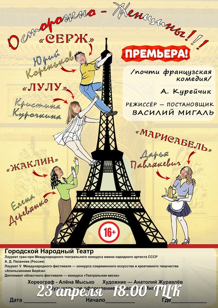 23 апреля в 18.00 на сценической площадке ГЦК «Победа» народный городской театр представляет спектакль «Осторожно, женщины!», режиссер-постановщик Василий Мигаль.
