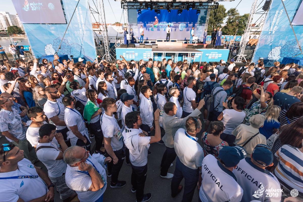 На большой сцене в главной фан-зоне, являющейся площадкой проведения мероприятий культурной программы Игр, награды высшего достоинства получили прынун в высоту Максим Недосеков, копьеметательница Татьяна Холодович и бегунья Эльвира Герман. Их коллегам по команде – прыгунье в длину Анастасии Мирончик-Ивановой, а также бегунам Виталию Парахонько и Кристине Тимановской вручено «серебро».