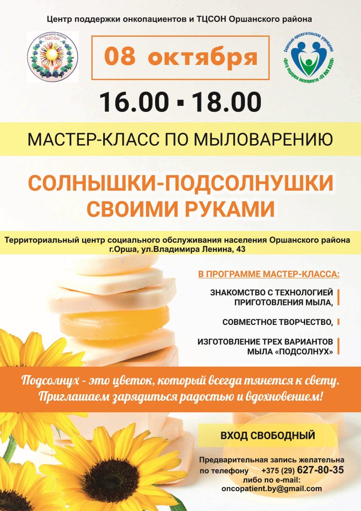 Территориальный центр Оршанского района совместно с центром поддержки онкопациентов ”Во имя жизни“ приглашает на встречу-презентацию 8 октября 2019 года с 16.00 до 18.00, где пройдет мастер-класс по мыловарению ”Солнышки-подсолнушки своими руками“.