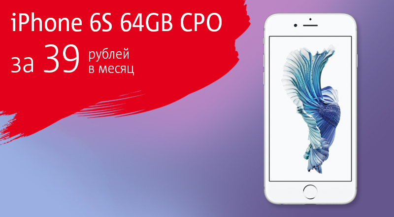 Смартфон Apple iPhone 6s CPO 64 Гб можно приобрести за 755 рублей. При покупке в рассрочку на год ежемесячный платеж за него составит 81 рубль, а при рассрочке на 2 года – 39 рублей.