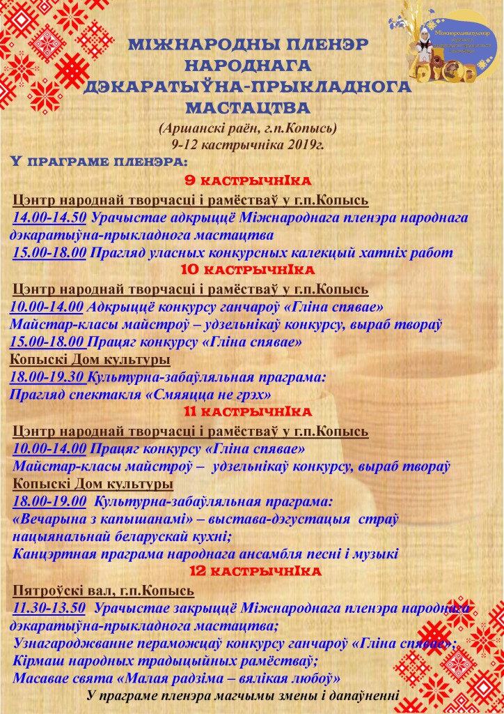 Предусмотрена конкурсная программа “Гліна спявае». Жюри выберет лучшие работы в пяти номинациях. Мастера привезут с собой домашние коллекции. А в дни пленэра им предстоит сделать из глины посуду, игрушку, изделие декоративно-глиняной пластики. Также будет назван победитель в номинации «Сбережение и развитие гончарных традиций».