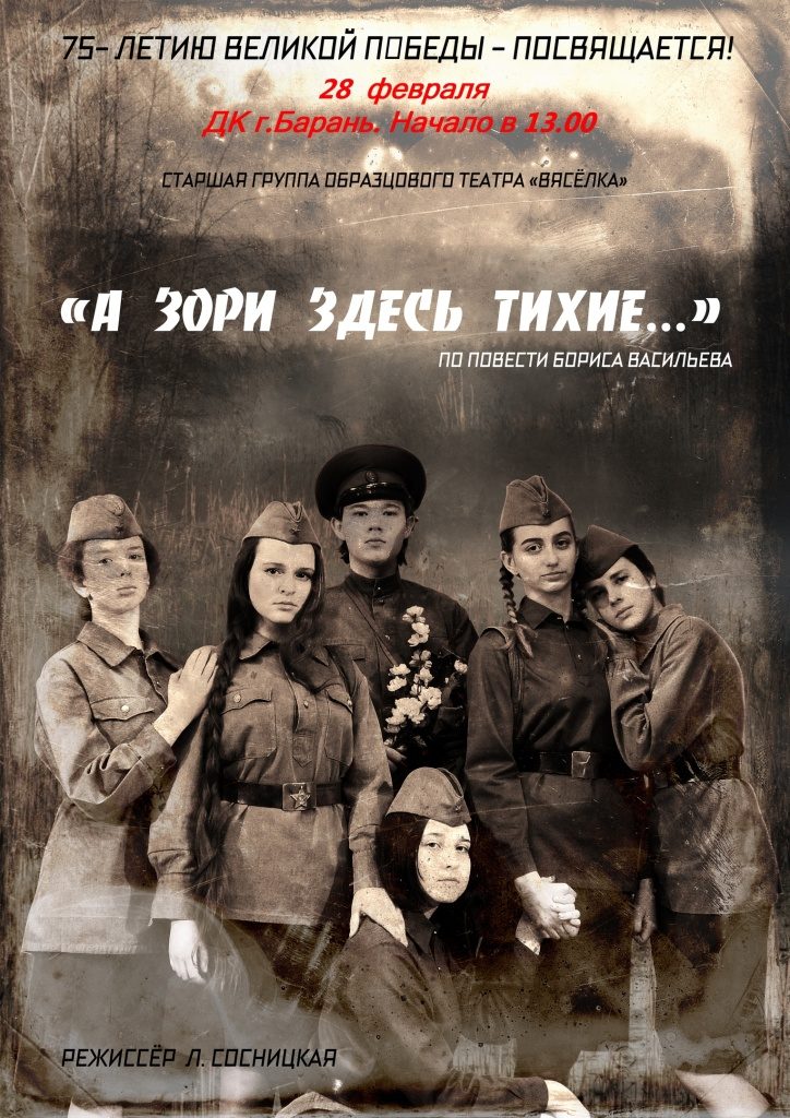 «Мы постараемся показать трагедию человеческой жизни через призму войны, — говорит режиссер спектакля Людмила Сосницкая. — «А зори здесь тихие» — новая творческая работа ребят из старшей группы театра «Вясёлка». Я надеюсь, что все, кому дорога память о войне, придут к нам на премьеру».