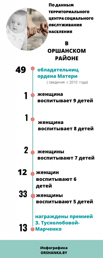 В Оршанском районе проживает более 80 тысяч женщин, в 1026 многодетных семьях воспитывают 3299 детей. 49 оршанок — многодетные матери, воспитывающие пять и более детей — награждены орденом Матери.