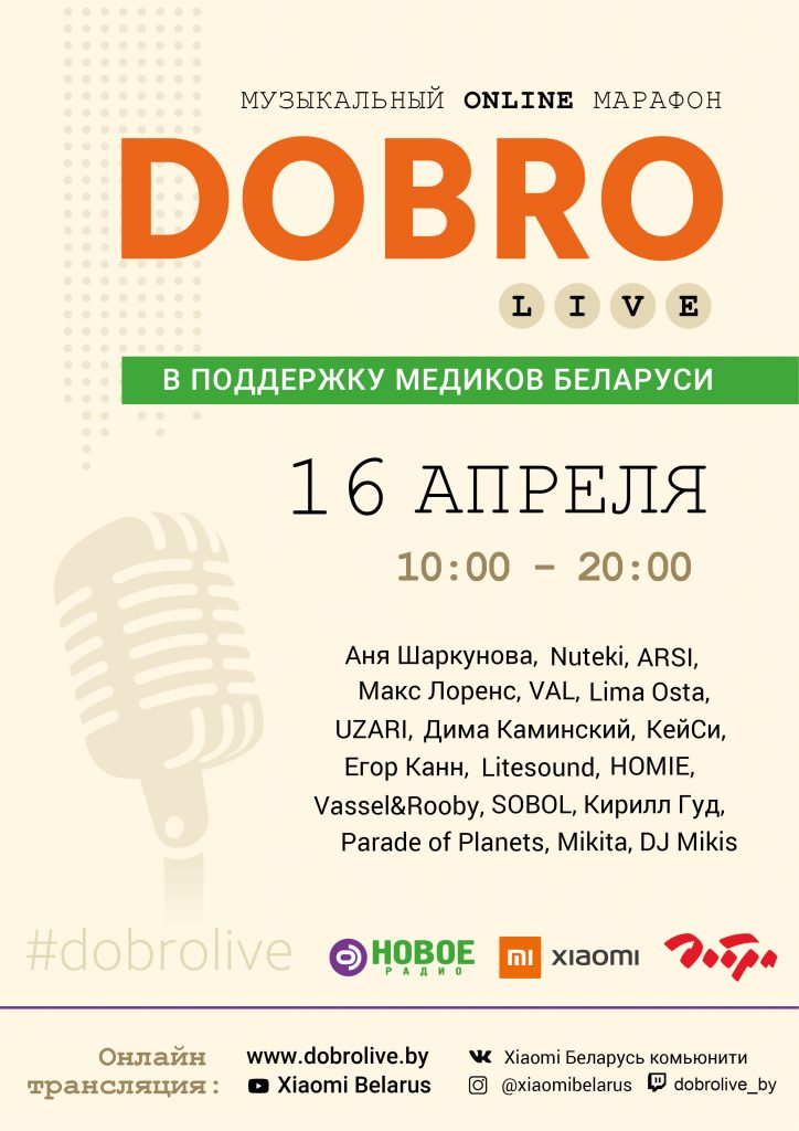 16 апреля с 10:00 до 20:00 стартует музыкальный благотворительный онлайн-марафон «Добро» в поддержку перечислений для закупки и производства средств защиты для белорусских медиков: лицевых щитков, специализированных масок с фильтрами, защитных костюмов.