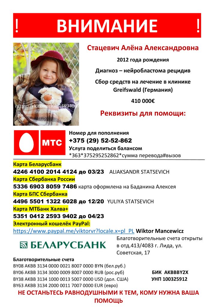 В 2016 году в дом семьи Стацевич из Лиды пришла беда. Младшая дочь Алёна в возрасте 3,5 лет заболела беспощадной болезнью — нейробластомой 4 стадии (раком).