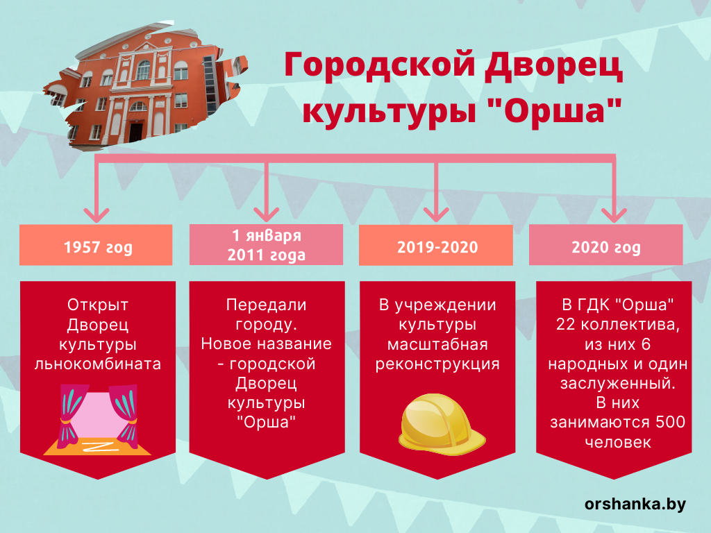 Дворец культуры льнокомбината был основан в 1957 году. 1 января 2011 году учреждение культуры передали в ведомство города. С этого времени его называют городским Дворцом культуры «Орша». Здесь работает 22 кружка, из них 6 народных и один заслуженный.