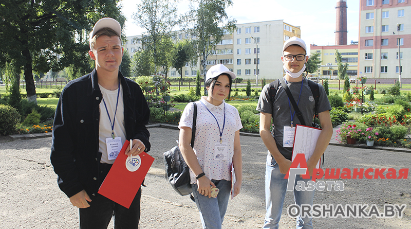 На выходе из участка с избирателями общаются волонтеры БРСМ Даниил Радионов, Варвара Шушкевич и Владислав Савченко.