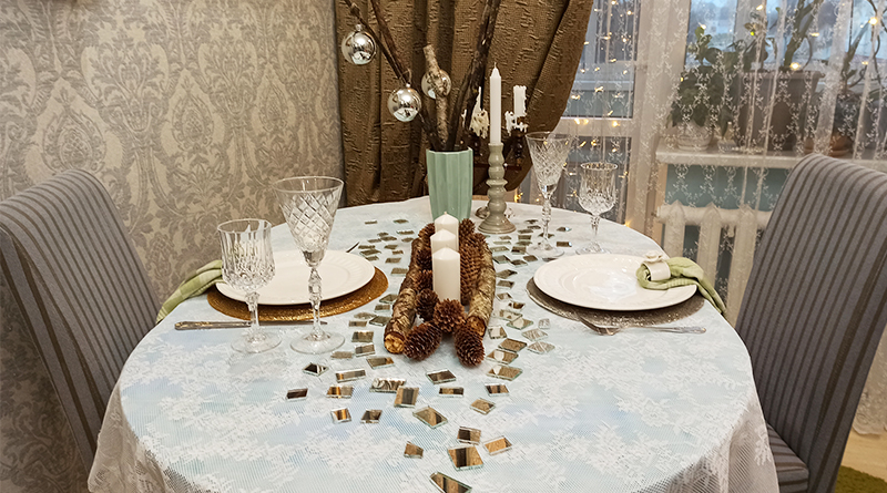 Символ 2021 года – Белый металлический Бык. В украшении стола я использовала скатерть и тарелки белого цвета, приборы серебристого цвета, свечи в металлических подсвечниках. Можно использовать различные природные материалы. У меня это дерево, шишки, стекло.
