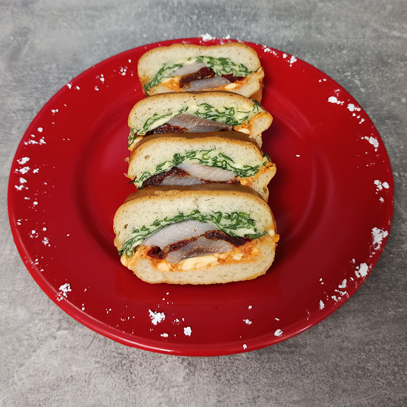 Приготовление. Багет разрезать вдоль. Вынуть мякоть. Получится две лодочки. Мягкое масло разделить по 100 г и положить в разные тарелки. В первую добавить шпинат (укроп, петрушку) и мякоть одной части багета, перемешать до однородной массы. Ко второй части масла добавить томатную пасту и оставшуюся мякоть багета. Заполнить «лодочки» разными начинками, в центр выложить филе сельди и вяленые помидоры. Аккуратно соединить и плотно сжать багет. Туго закрутить в пищевую пленку и оставить в холодильнике на три часа. Перед подачей нарезать острым ножом порционные кусочки толщиной 2 см.