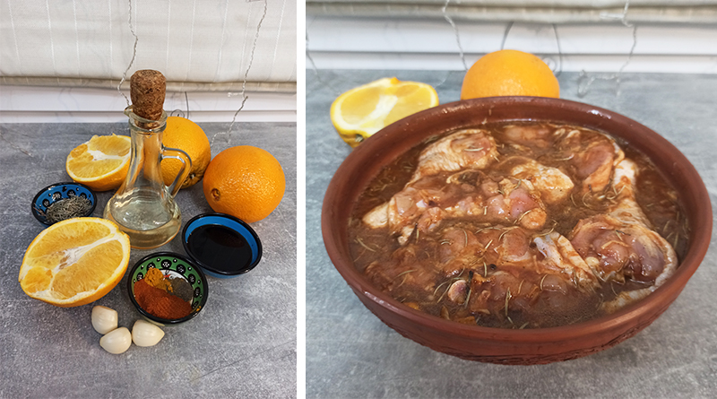 Нам понадобятся следующие ингредиенты: курица (бедра, голень), апельсины – 3 шт., розмарин, чеснок, соевый соус – 4 ст. л., масло растительное – 2 ст. л., имбирь, черный перец, соль по вкусу.