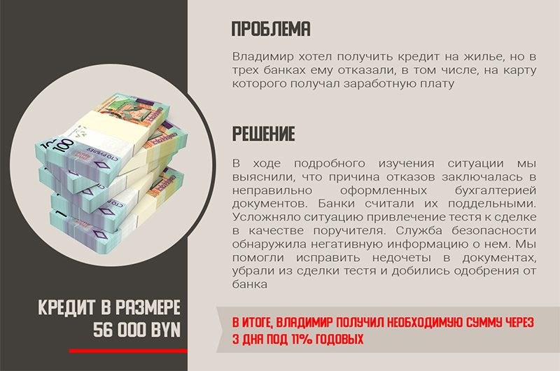 Обратиться к кредитному брокеру финансово-правового объединения “Феникс”! Наш специалист выслушает вашу ситуацию, запросит кредитную историю, изучит все предоставленные документы. Опыт в сфере кредитного анализа позволяет сразу брать во внимание проблемные зоны и их рассматривать наиболее пристально. В итоге, найдя причину отказа, менеджер устраняет ее по возможности либо закрывает дополнительными преимуществами.