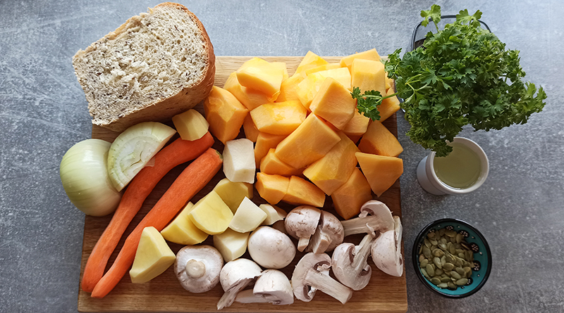 Для приготовления нам понадобятся следующие ингредиенты: тыква – 800 г, картофель мелкий – 2 шт., морковь средняя – 2 шт., 1 луковица, вода – 600 мл, шампиньоны – 200 г, масло подсолнечное – 50 мл, петрушка, тыквенные семена, белый хлеб для сухариков – 200 г (мне нравится хлеб с льняными семечками), соль.