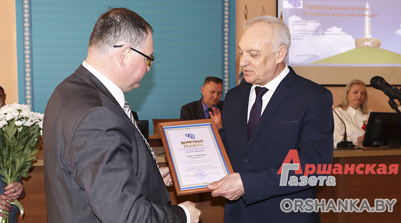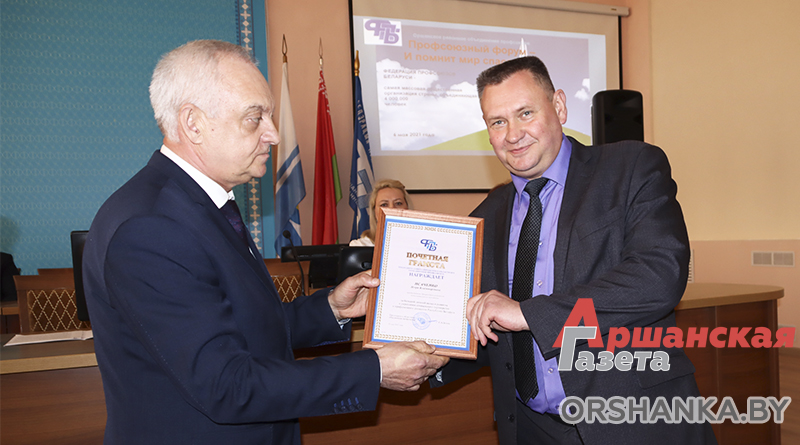 Приятным моментом форума стало вручение Почетных грамот Витебского областного объединения профсоюзов председателю Оршанского районного исполнительного комитета Игорю Исаченко и заместителю председателя – начальнику управления по сельскому хозяйству и продовольствию Андрею Константинову, Почетной грамоты Оршанского районного объединения профсоюзов старшей акушерки отделения патологии беременности городского родильного дома Светлане Базановой.