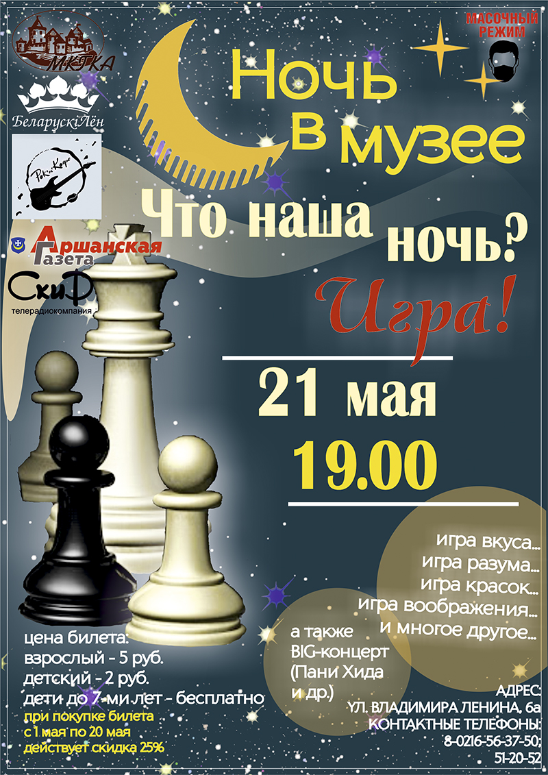 21 мая 2021 года в Городской художественной галерее В.А. Громыко (здание коллегиума иезуитов) пройдет культурно-развлекательный проект «Ночь в музее. Что наша ночь? ИГРА!», посвящённый Международному дню музеев.